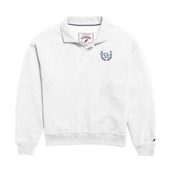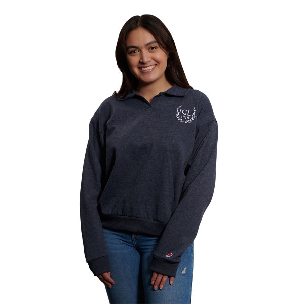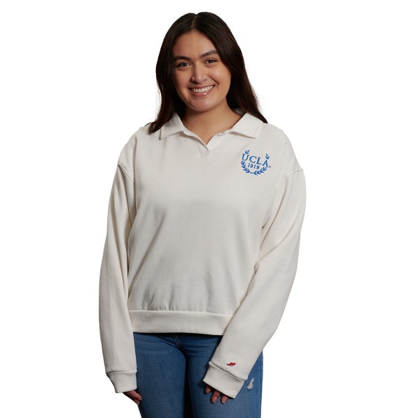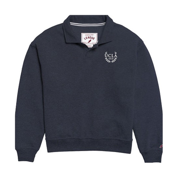 Pinit UCLA Women's Collared Sweatshirt SKU: 475471-NAVY-X-LARGE- $69.00 Quantity discounts available QuantityPrice Color - Size - X-LARGE Quantity -+ Add to Shopping Cart Details By League LegacyStraight silhouette, dropped shoulder, cuffed hem, and buttonless polo collar with embroidered detailsTri-blend fleece: 50% Polyester ... Details Back DetailsBy League LegacyStraight silhouette, dropped shoulder, cuffed hem, and buttonless polo collar with embroidered detailsTri-blend fleece: 50% Polyester / 45% Cotton / 5% RayonImported